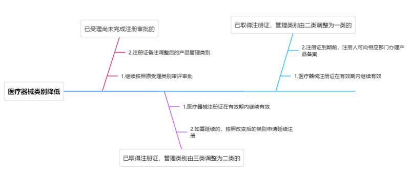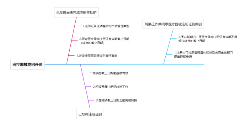 二、管理類型升高 1、已受理醫(yī)療器械 對于公告發(fā)布之日前已受理尚未完成注冊審批(包括首次注冊和延續(xù)注冊)的醫(yī)療器械,藥品監(jiān)督管理部門繼續(xù)按照原受理類別審評審批,準予注冊的,核發(fā)醫(yī)療器械注冊證,限定醫(yī)療器械注冊證有效期截止日期為過渡期截止日期,并在注冊證備注欄注明調整后的產品管理類別。 2、已取得二類醫(yī)療器械注冊證